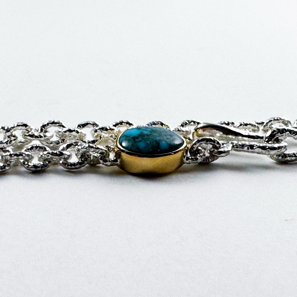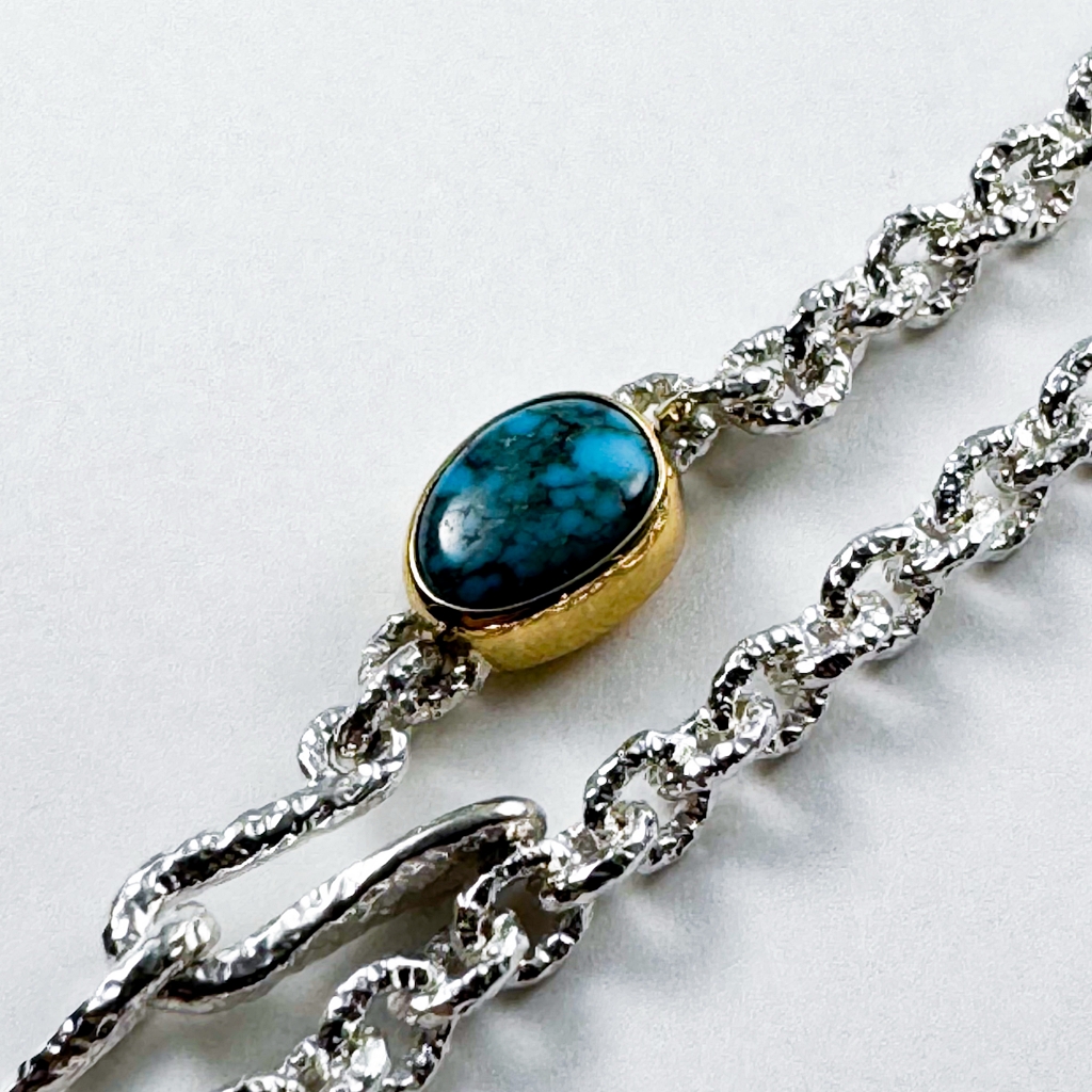 Lone Mountainの独特の色合いが、ベゼル(石のケース)K20イエローゴールドと相性が良く、石をさらに引き立てている。