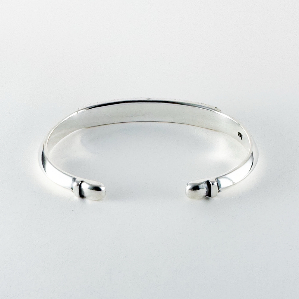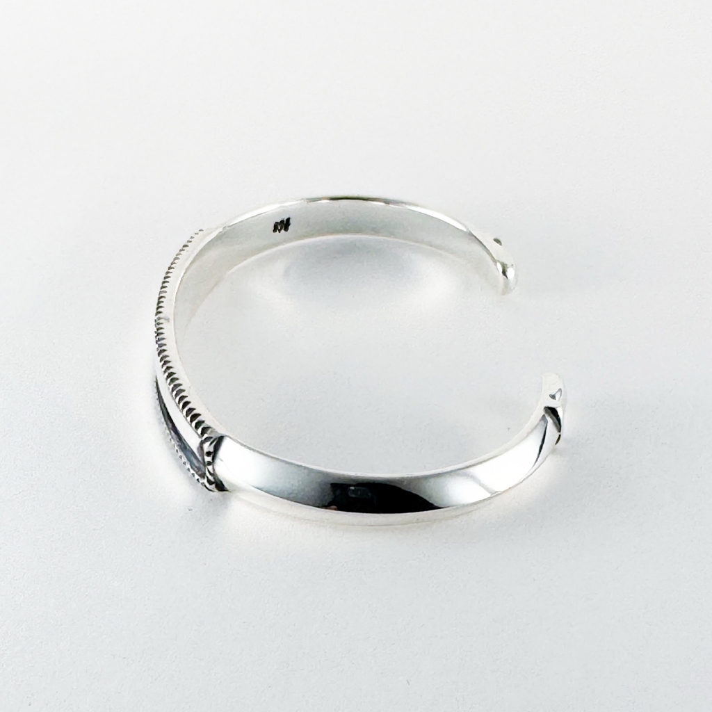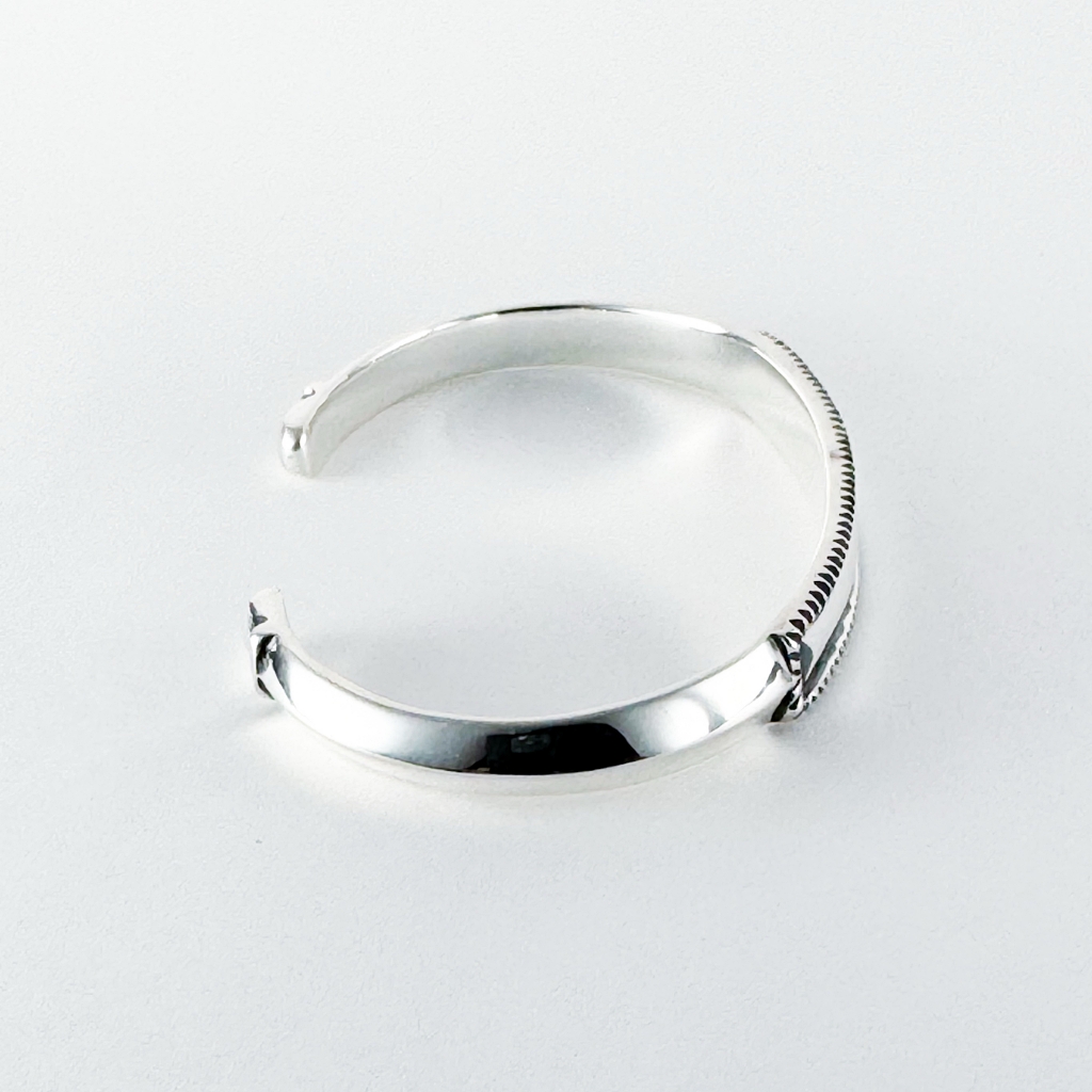 幅最大:約9mm 開口部:約2.2cm 内 周:約14.6cm 重 さ:約29g ※開口部と内周の和が大よその腕回り寸法。 ※ハンドメイドのため小キズや、寸法や重さはばらつきが出ます。 ※K18以上のゴールドでの制作も時価で承ります。 |