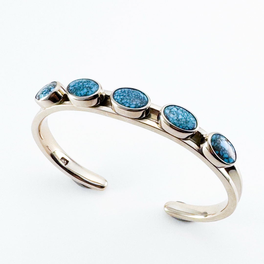 このブレスレットの石はもちろん純天然で、気品ある水色に黒色のマトリクス。