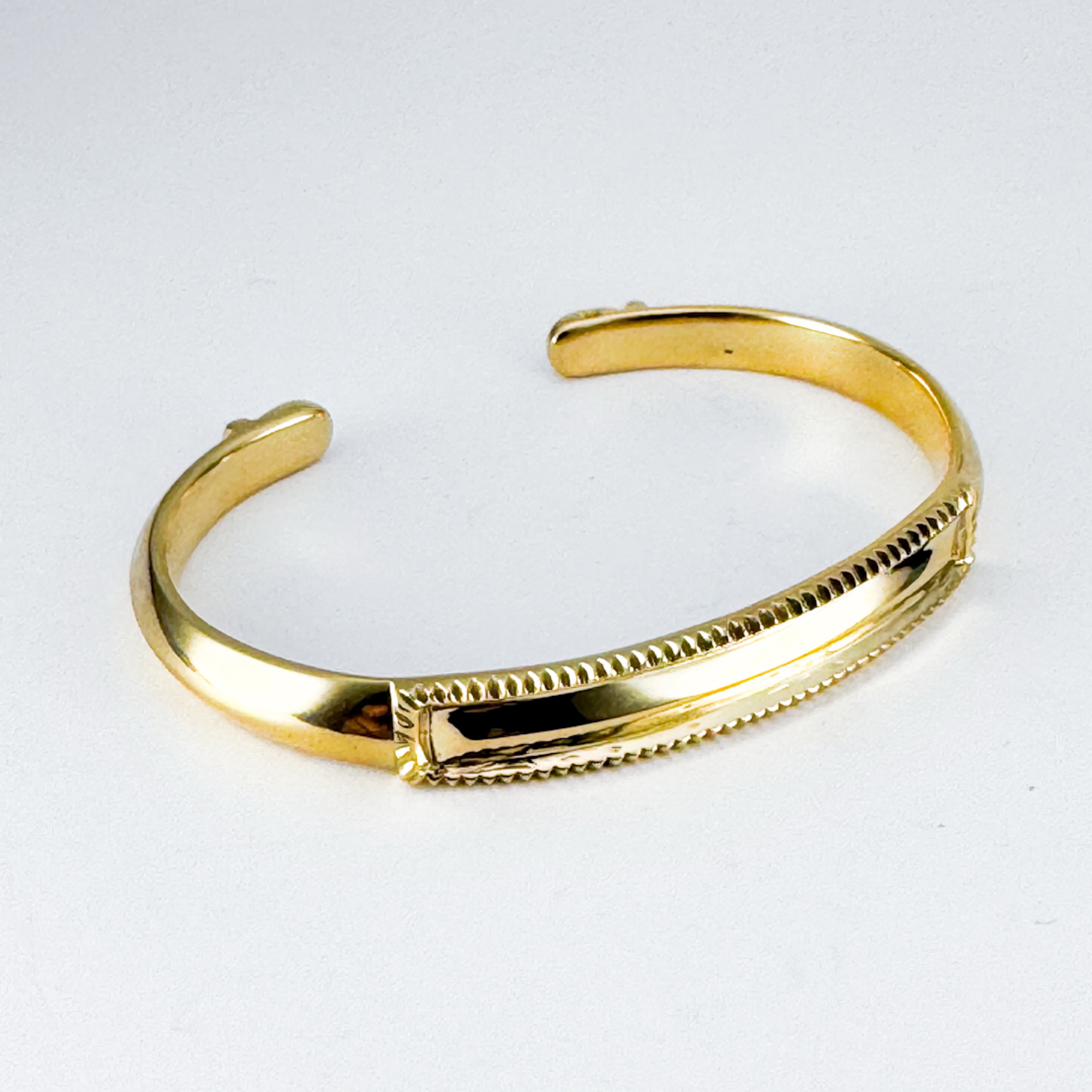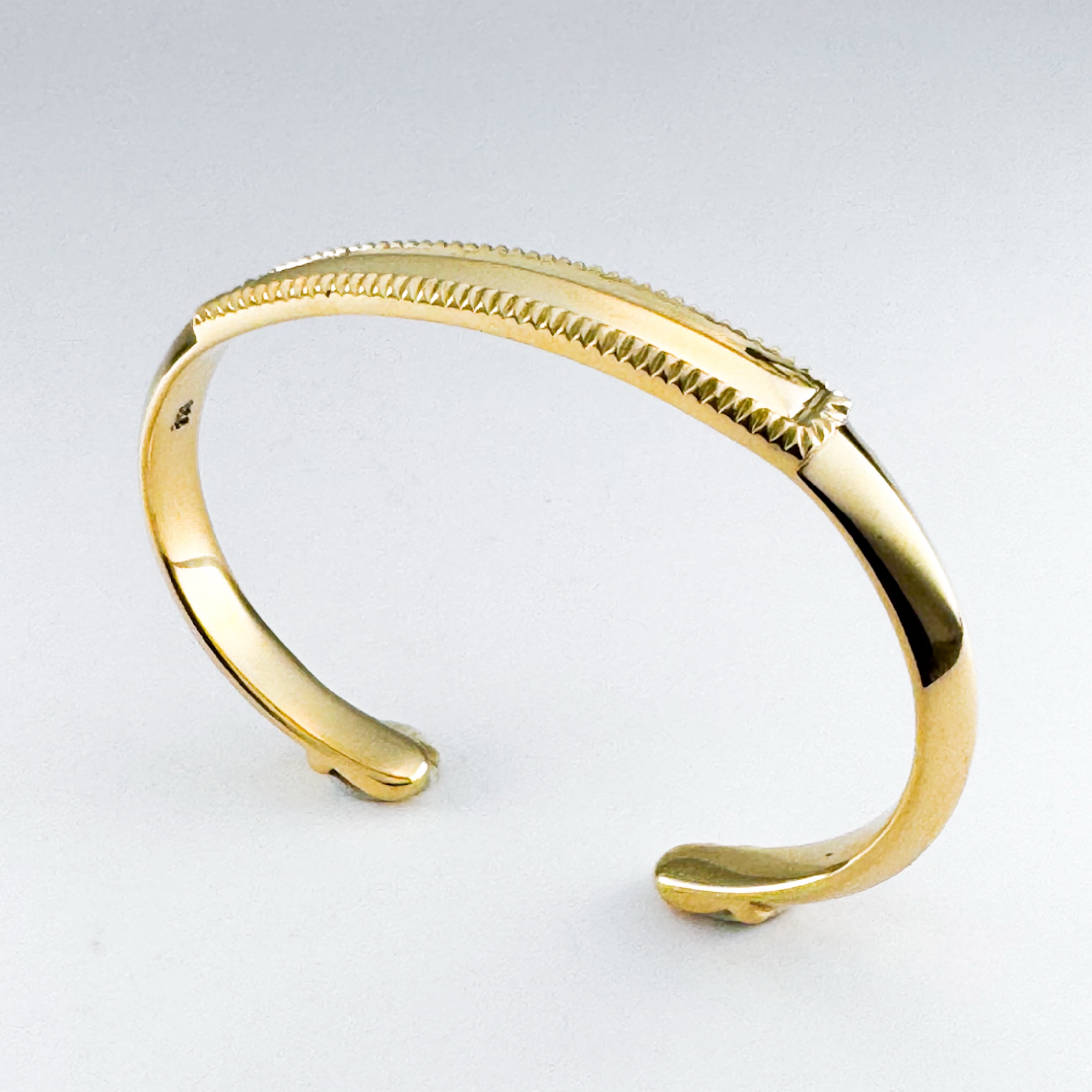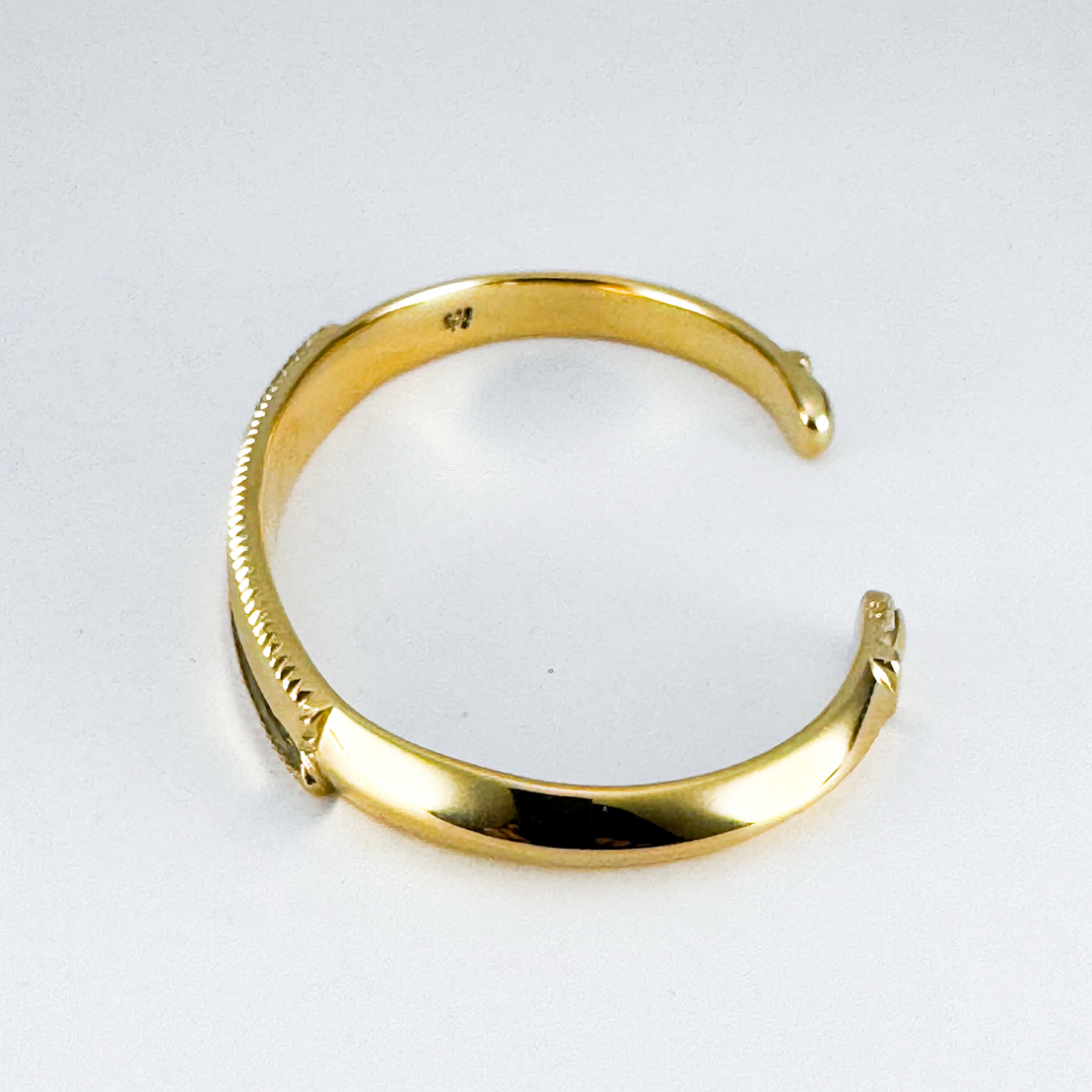 最大幅:約9mm 開口部:約21mm 内 周:約147mm 重 さ:約43.7g ※開口部と内周の和が大よその腕回り寸法。 内周を小さくする加工や開口部を調整する事は、デザインや強度を損なわない範囲で可能。 オリジナルでは内周が小さい場合はご相談下さい。オーダーで新規制作致します。 ※ハンドメイドのため小キズや、寸法や重さはばらつきが出ます。 |