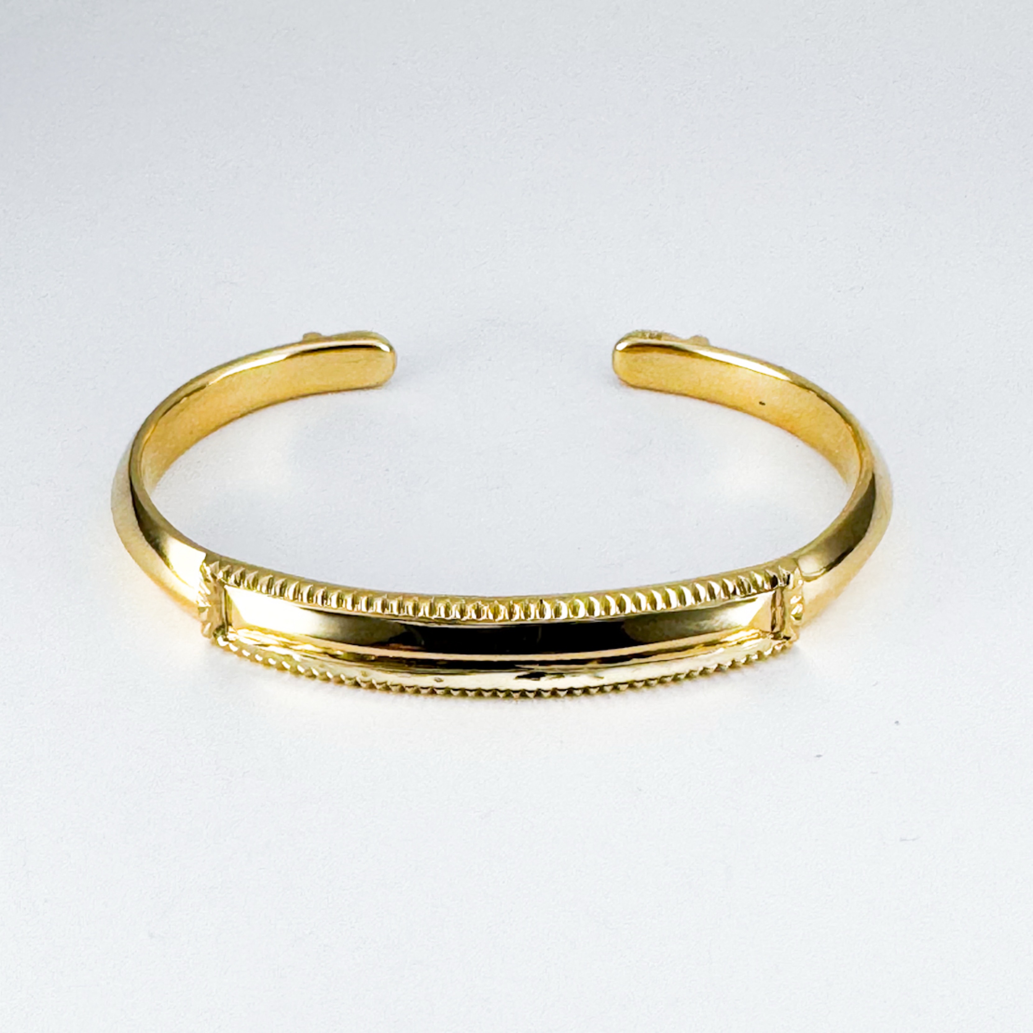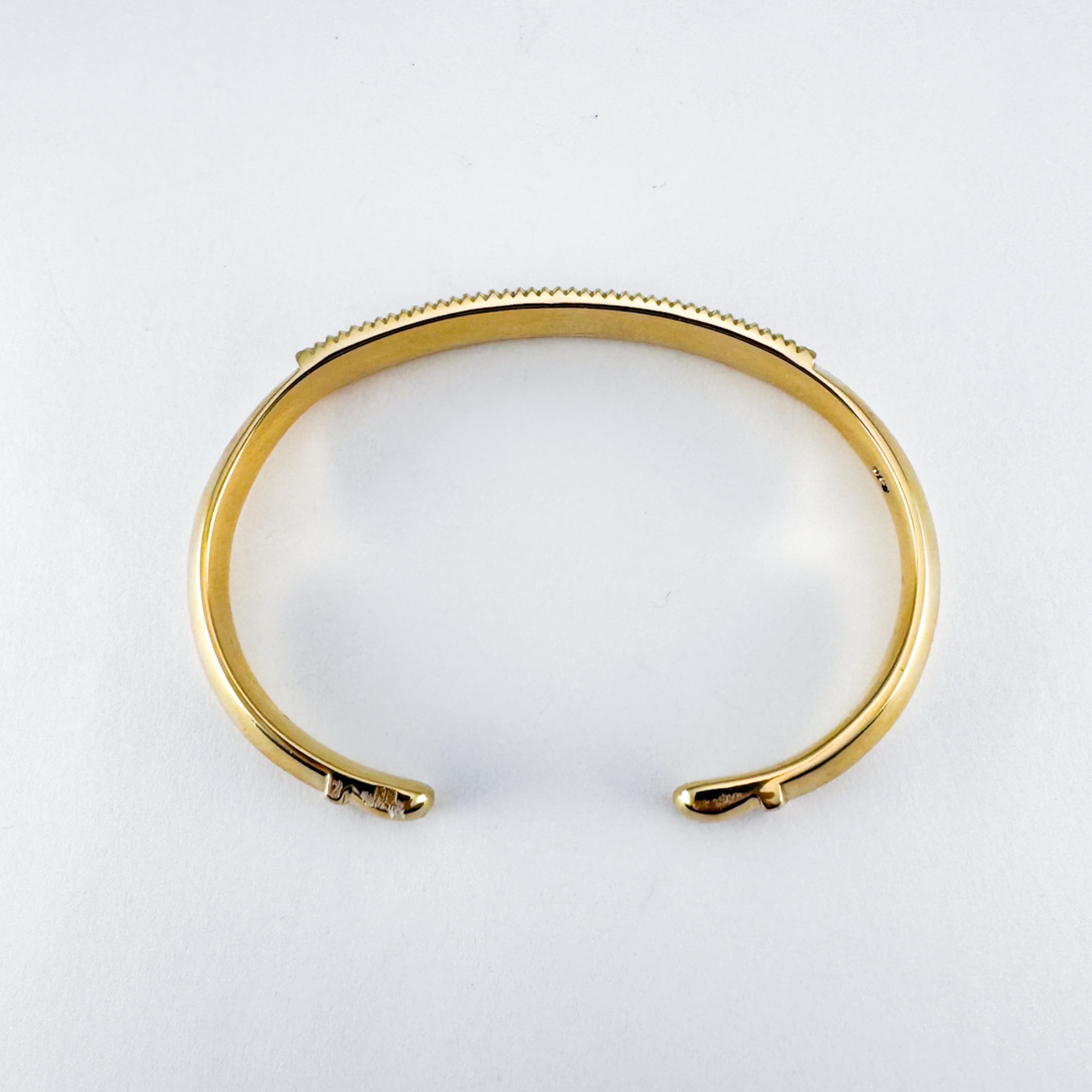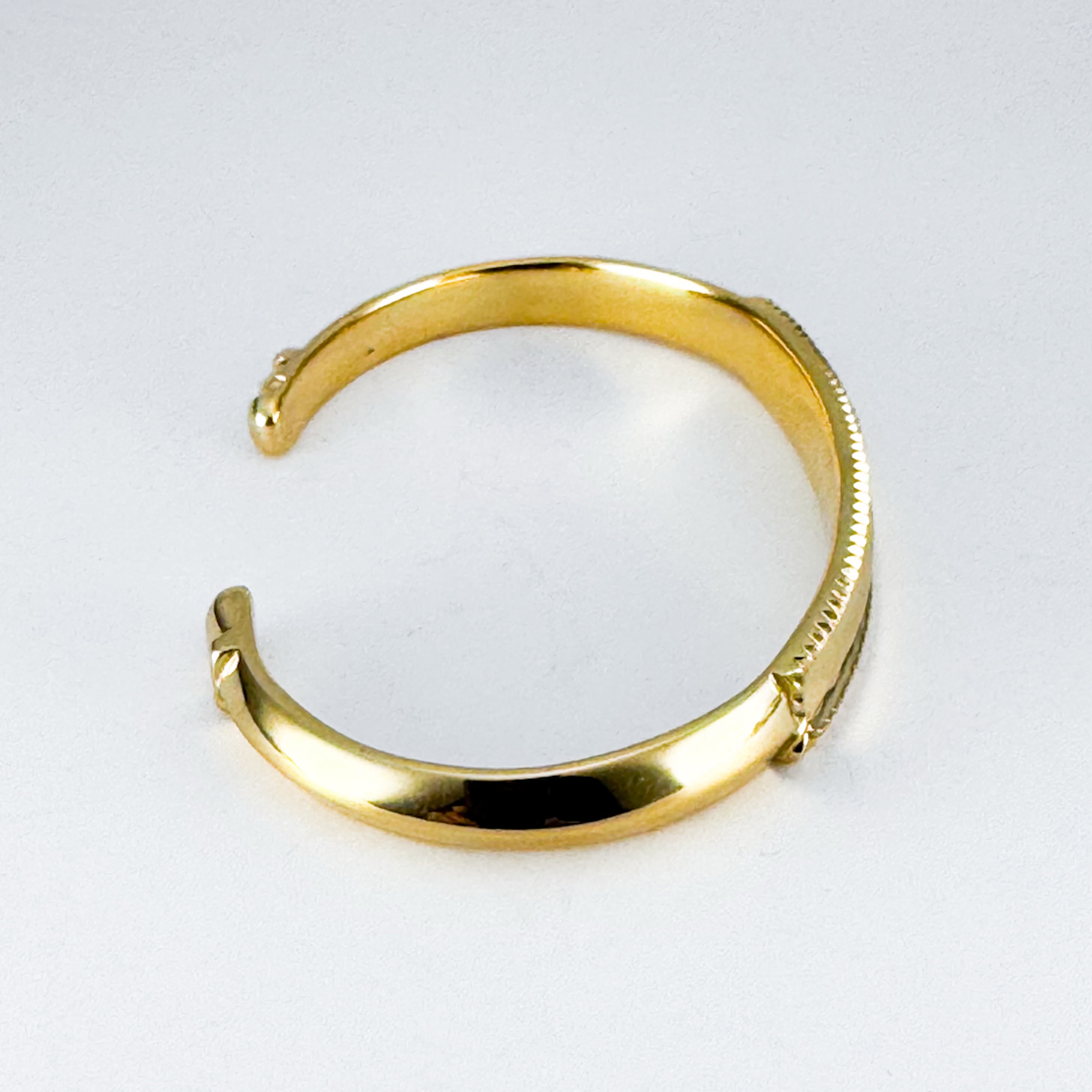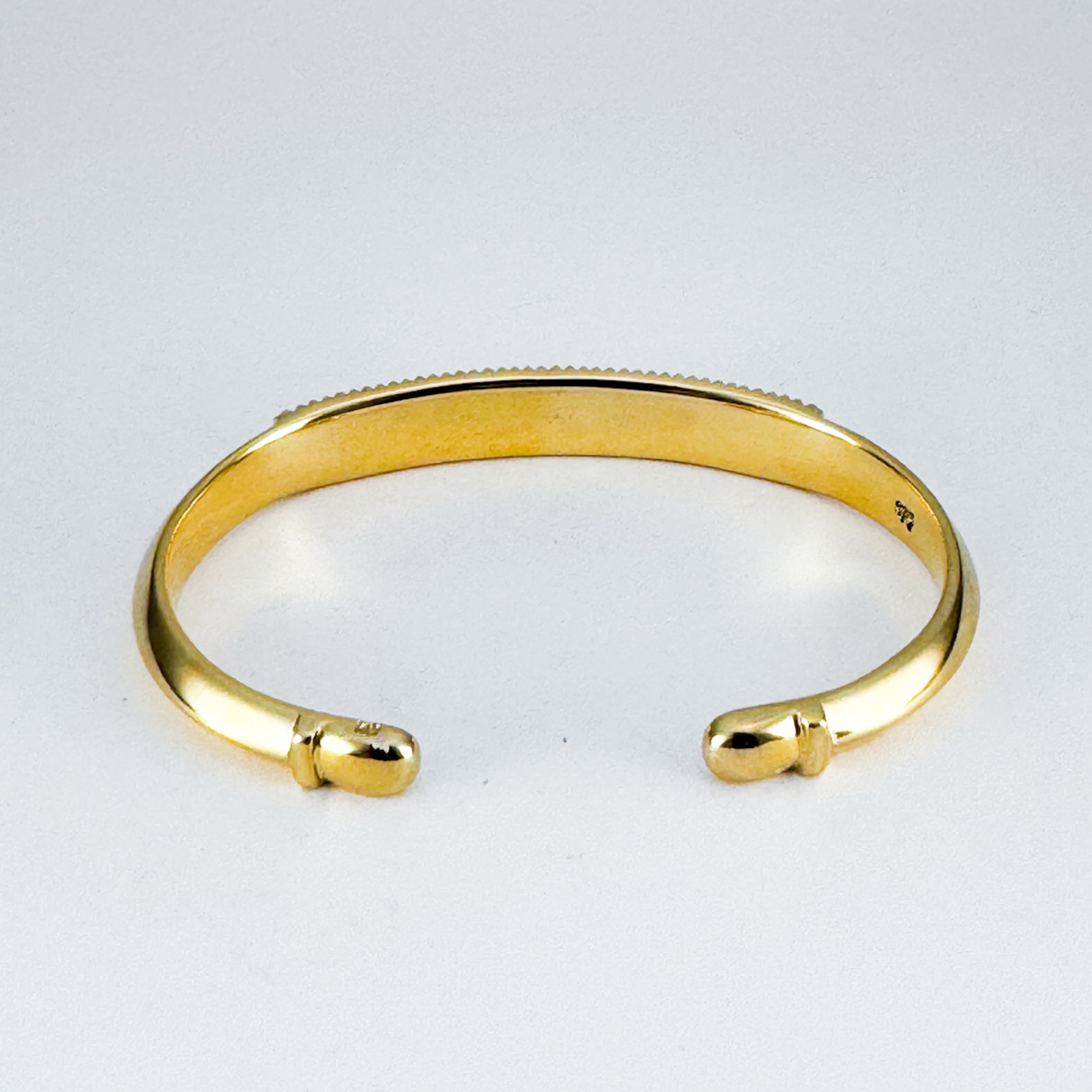 最大幅:約9mm 開口部:約21mm 内 周:約147mm 重 さ:約43.7g ※開口部と内周の和が大よその腕回り寸法。 内周を小さくする加工や開口部を調整する事は、デザインや強度を損なわない範囲で可能。 オリジナルでは内周が小さい場合はご相談下さい。オーダーで新規制作致します。 ※ハンドメイドのため小キズや、寸法や重さはばらつきが出ます。 |